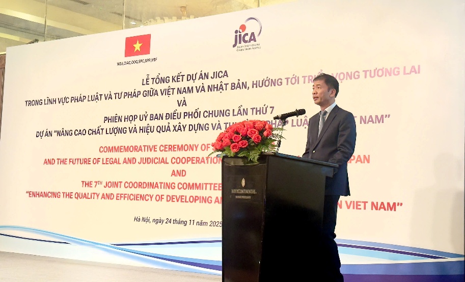 Phát biểu khai mạc buổi Lễ, Thứ trưởng Bộ Tư pháp Nguyễn Thanh Tịnh khẳng định hợp tác pháp luật – tư pháp giữa Việt Nam – Nhật Bản trong hơn 30 năm qua là biểu tượng của sự tin cậy và hợp tác hiệu quả. Thay mặt các cơ quan đối tác Việt Nam, Thứ trưởng Nguyễn Thanh Tịnh gửi lời cảm ơn tới Chính phủ Nhật Bản, Bộ Tư pháp Nhật Bản, JICA và các chuyên gia hai nước vì những hỗ trợ bền bỉ, thiết thực trong quá trình hoàn thiện thể chế và đào tạo nguồn nhân lực pháp lý cho Việt Nam. Đồng chí nhấn mạnh, trong bối cảnh Việt Nam triển khai các Nghị quyết số 27-NQ/TW và 66-NQ/TW về đổi mới công tác xây dựng và thi hành pháp luật, việc tiếp tục hợp tác với Nhật Bản – quốc gia có kinh nghiệm tư pháp hiện đại và chuyển đổi số mạnh mẽ là rất cần thiết. Việt Nam mong muốn Nhật Bản tiếp tục đồng hành trong các hoạt động chia sẻ kinh nghiệm, hỗ trợ hoàn thiện thể chế, đổi mới quy trình xây dựng và thi hành pháp luật, cũng như phát triển đội ngũ nhân lực pháp lý – tư pháp chất lượng cao. Bộ Tư pháp cam kết phối hợp chặt chẽ để triển khai hiệu quả những nhiệm vụ còn lại của Dự án JICA 2021–2025 và chuẩn bị cho giai đoạn hợp tác mới thực chất, sâu rộng và bền vững hơn.