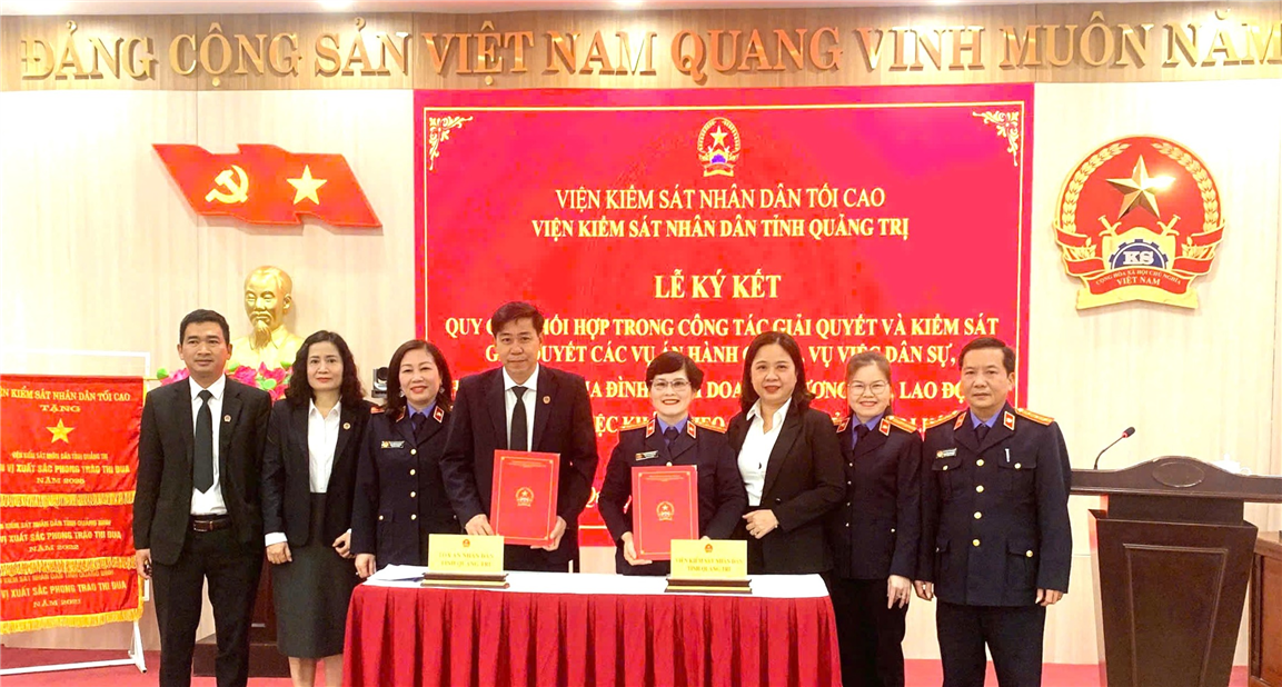 VKSND tỉnh Quảng Trị: Ngày 28/01/2026, VKSND tỉnh Quảng Trị và Tòa án nhân dân tỉnh tổ chức Lễ ký kết Quy chế phối hợp trong việc thi hành một số quy định nhằm nâng cao chất lượng công tác thụ lý, giải quyết và kiểm sát việc giải quyết các vụ án hành chính, vụ việc dân sự, hôn nhân và gia đình, kinh doanh thương mại, lao động và những việc khác theo quy định của pháp luật.