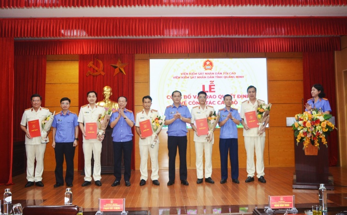 Sau khi đồng chí Vũ Thị Thanh Xuân, Trưởng Phòng Tổ chức cán bộ công bố các quyết định, đồng chí Phạm Viết Vượng, Viện trưởng VKSND tỉnh đã trao quyết định và tặng hoa chúc mừng các đồng chí nhận nhiệm vụ mới.