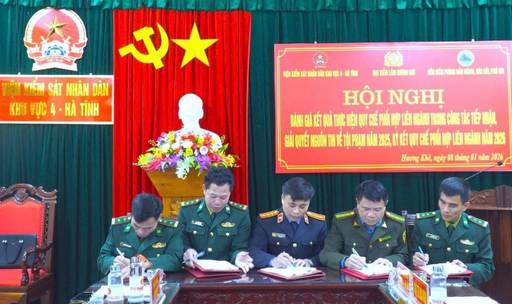 * Ngày 08/01/2026, VKSND khu vực 4, tỉnh Hà Tĩnh chủ trì tổ chức Hội nghị đánh giá kết quả thực hiện Quy chế phối hợp trong công tác tiếp nhận, giải quyết tin báo, tố giác về tội phạm năm 2025 và tiến hành ký kết Quy chế phối hợp liên ngành giữa VKSND khu vực 4, Hạt kiểm lâm khu vực Hương Khê, Đồn Biên phòng Bản Giàng, Phú Gia, Hoà Hải.