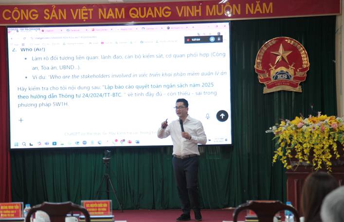 Tại lớp tập huấn, chuyên gia Nguyễn Văn Tuyền đã giới thiệu và hướng dẫn thực hành việc ứng dụng ChatGPT và các công cụ AI trong công tác chuyên môn nghiệp vụ của Kiểm sát viên. Các nội dung tập trung vào việc sử dụng AI để hỗ trợ xây dựng báo cáo, cáo trạng, rà soát ngôn ngữ pháp lý, kiểm tra báo cáo theo phương pháp tư duy ngược… Từ đó, giúp Kiểm sát viên làm việc khoa học, nhanh chóng và hiệu quả hơn. Đây là bước tiếp cận thực tiễn, giúp đội ngũ công chức hai cấp VKSND tỉnh Đồng Nai làm quen và ứng dụng trực tiếp trí tuệ nhân tạo vào công việc hằng ngày.